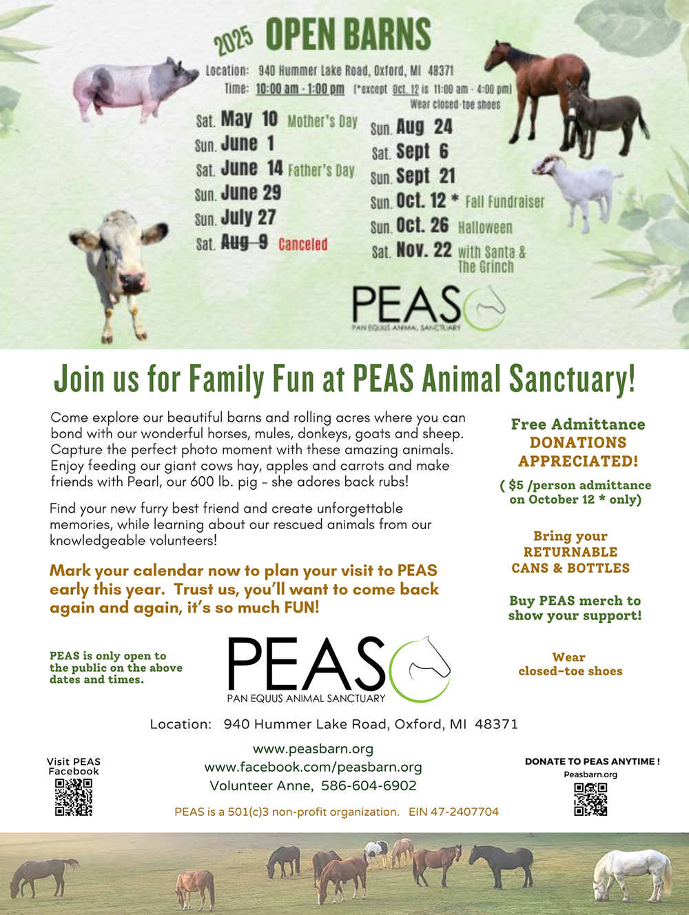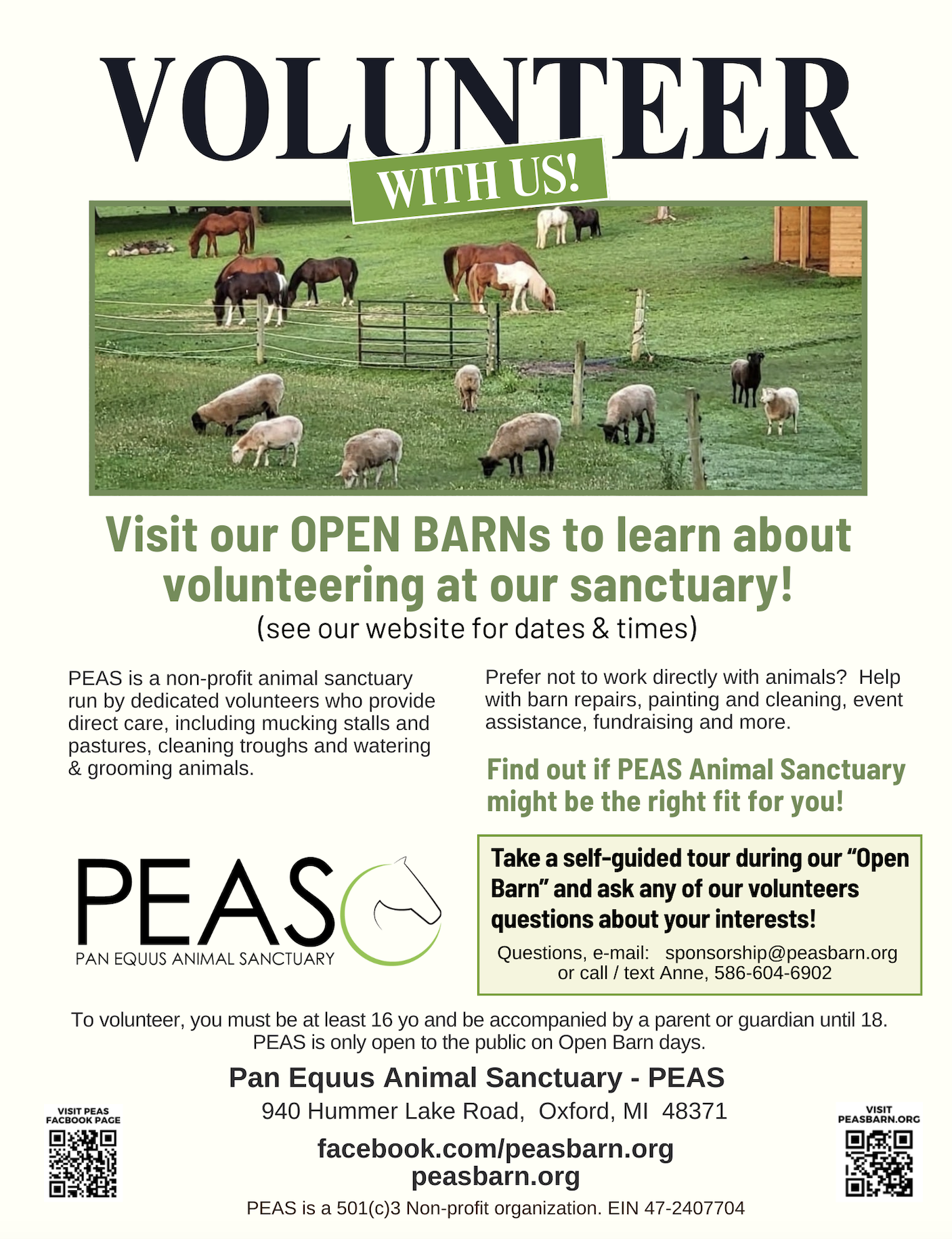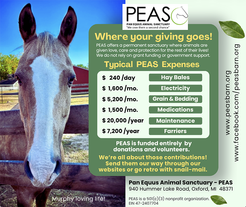 PEAS is a labor of love for our founders and volunteers. But love isn’t enough to keep the farm going. It is hard work, very hard work; carrying 60-pound bales of hay up a long driveway, often in inclement weather, cleaning stalls and hauling manure, making constant repairs around the farm.